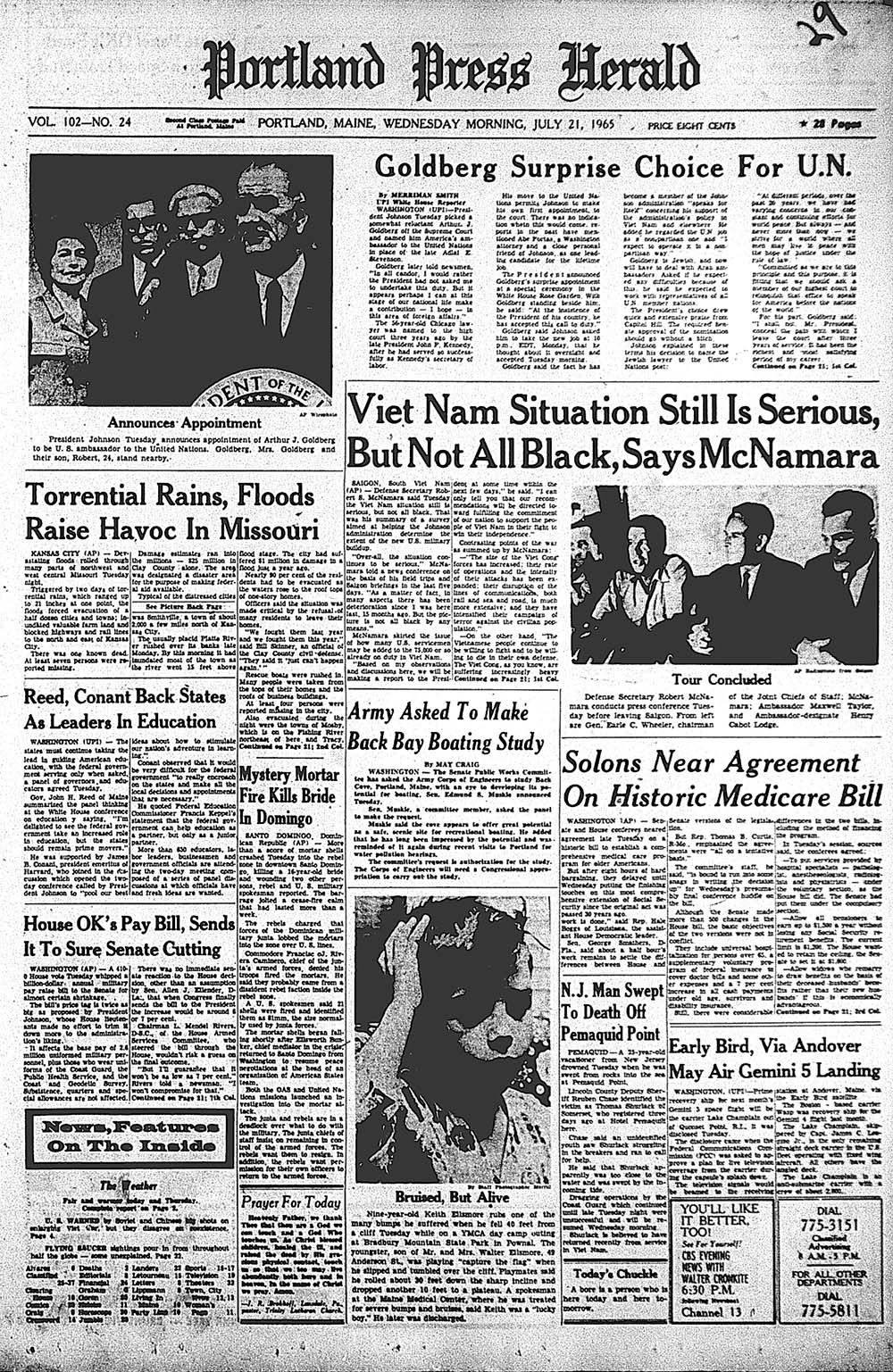View the historic front page from the Portland Press Herald: Boy who fell 40 feet off Bradbury Mtn. cliffs a ‘lucky boy;’ Muskie asked Army engineers to study Back Cove to develop boating potential