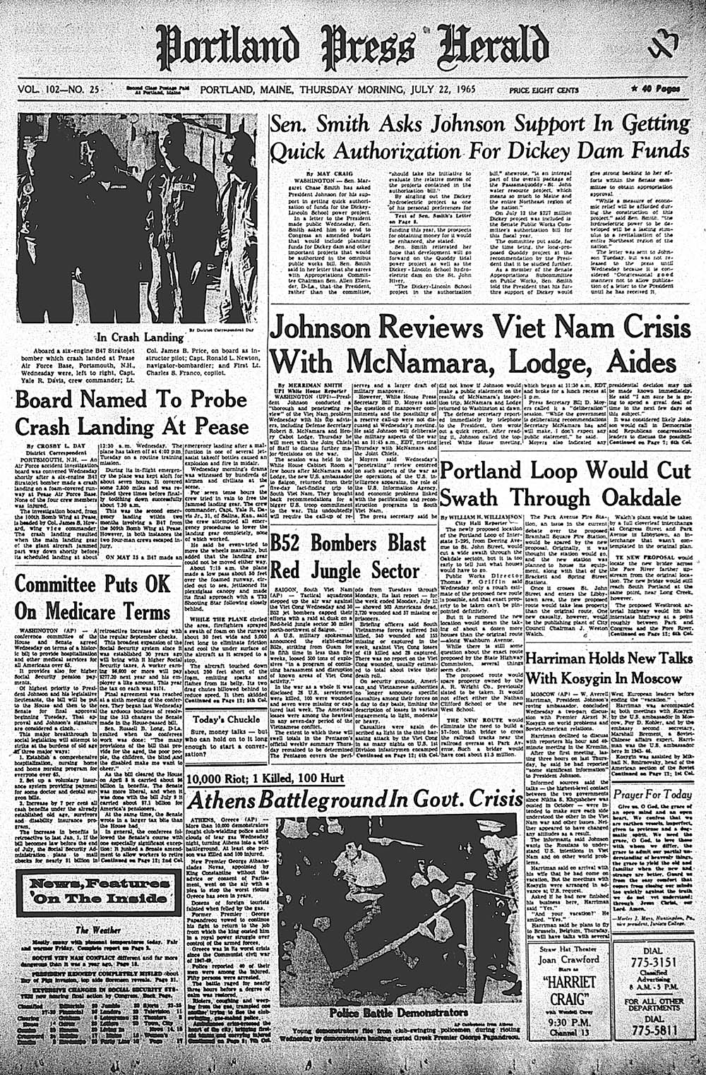 View the historic front page from the Portland Press Herald: Proposed loop of I-295 would cut a swathe through the Oakdale neighborhood; A B47 bomber crash lands a Pease Air Force Base