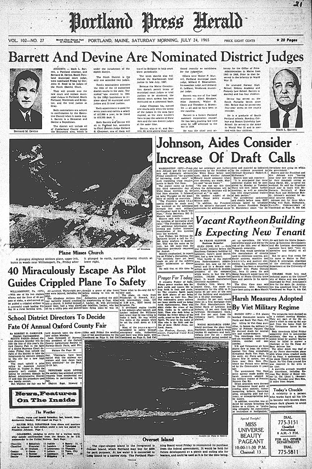 View the historic front page from the Portland Press Herald: Portland may pay $500 for Overset Island, off of Long Island to be used as a park; Pilot miraculously guides crippled plane to safety