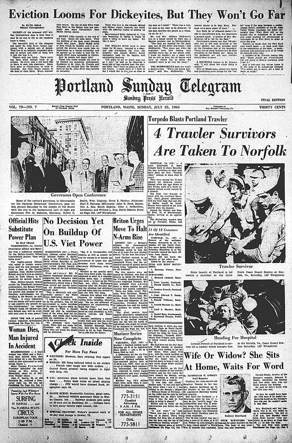 View the historic front page from the Portland Sunday Telegram: Portland trawler blown to bits when it catches torpedo in its nets