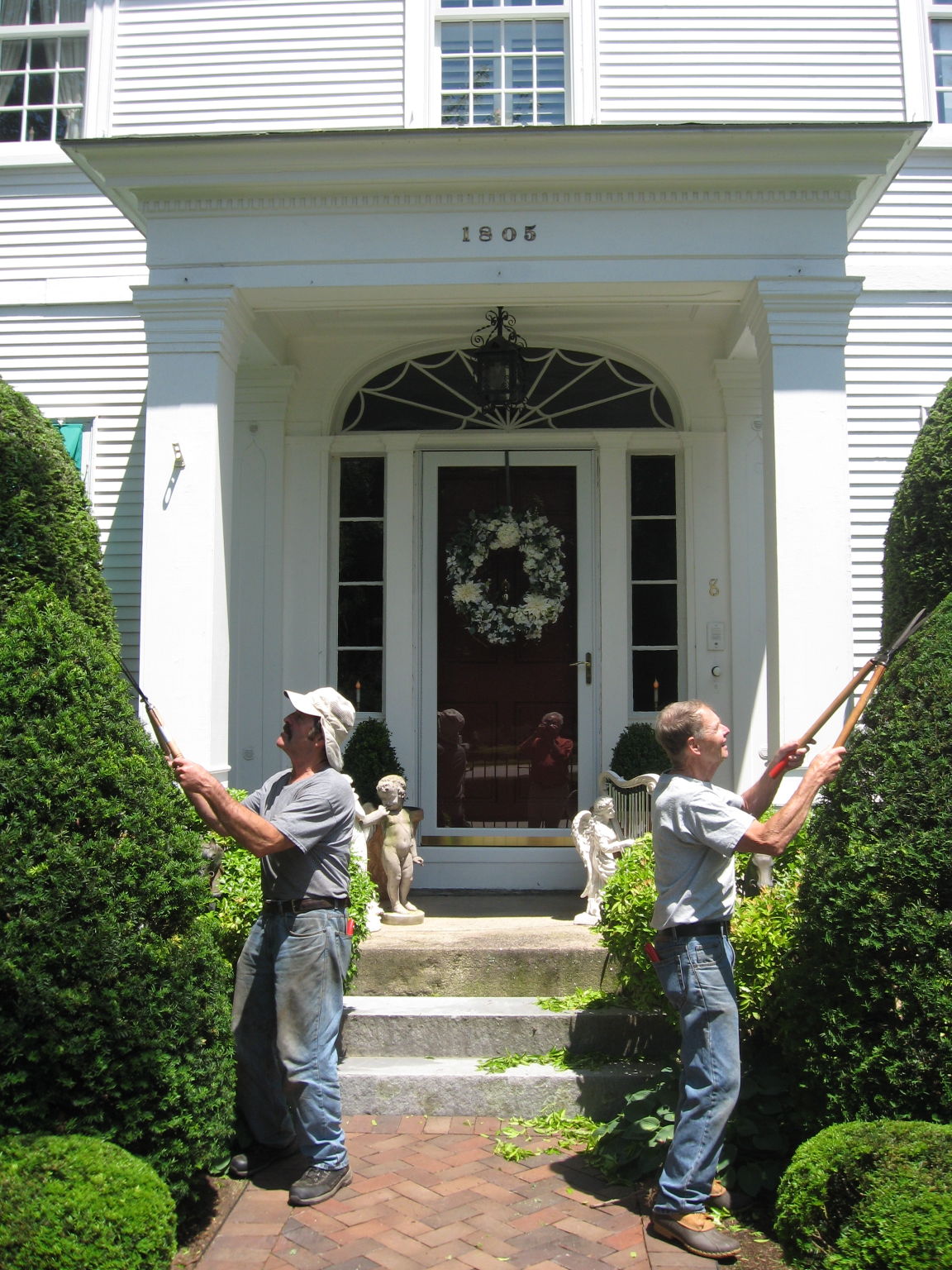 With the Dorcas Society fair set for Saturday, July 18, at Tory Hill in Buxton, William Smith of Gorham, right, and Norman Landry of Westbrook trim shrubs at the 1805 Brewster Mansion owned by Richard and Beverly Atkinson. They will host a car show and open their barn and grounds for tours during the fair. Staff photo by Robert Lowell