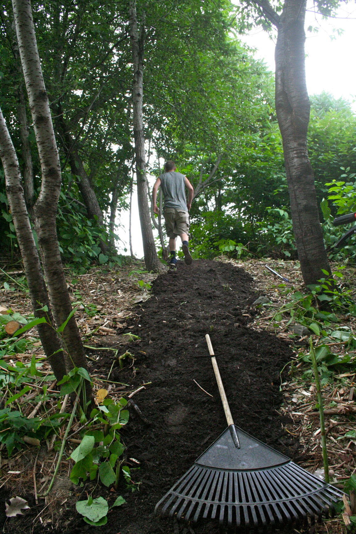 A volunteer walks along a patch of trail behind Hannaford last week after raking mulch onto the path.Staff photos by Andrew Rice