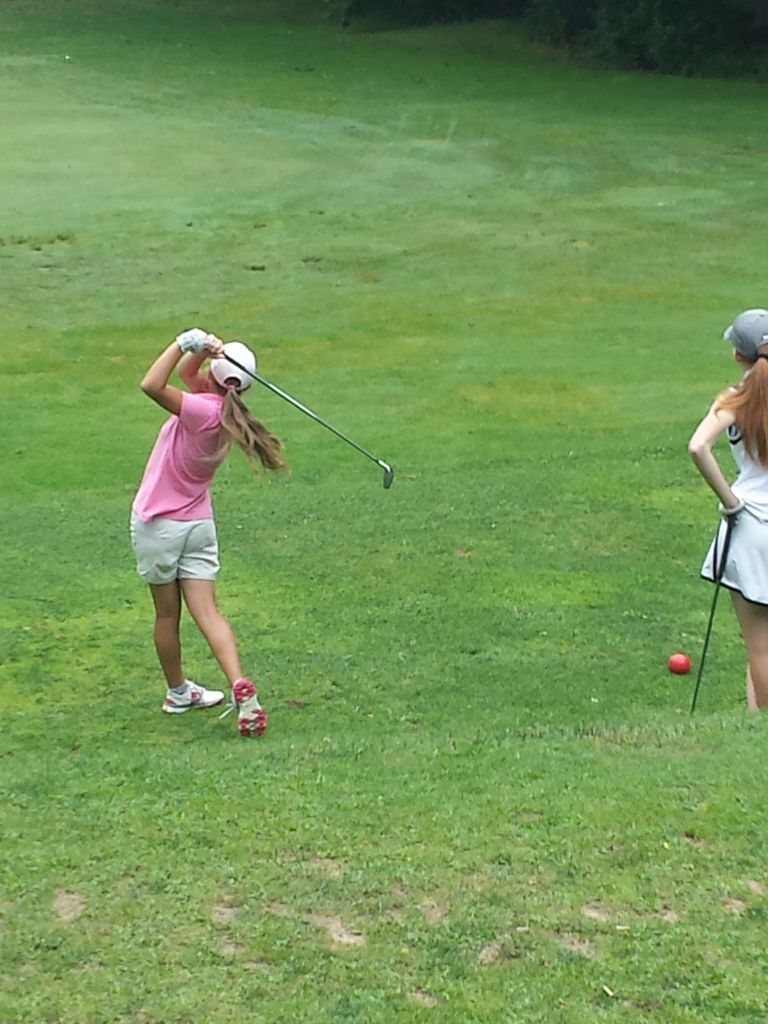 Stephanie Rodrigue hits a tee shot as Janelle Bryant looks on during last week’s second annual South Portland Junior Open Golf tournament at the South Portland Municipal Golf Course. Rodrigue won the girls’ 13-17 division with an 18-hole score of 75, nine strokes better than Bryant, the runner-up. Koto Yamada won the girls’ 9-12 age division with a nine-hole score of 46, three better than runner-up Ruby Haylock.