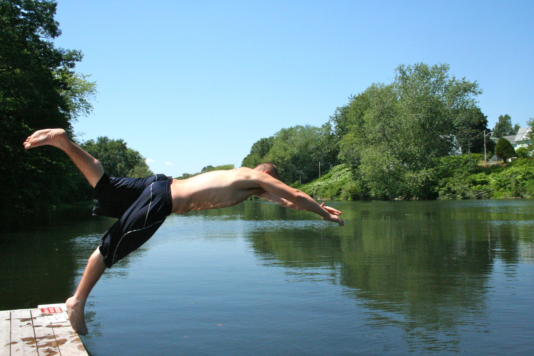 Anthony Alfreds dives into the Presumpscot River from a float near Riverbank Park Monday. Alfreds, who lives in Westbrook, said he’s been swimming off the dock nearly every day. Staff photo by Andrew Rice