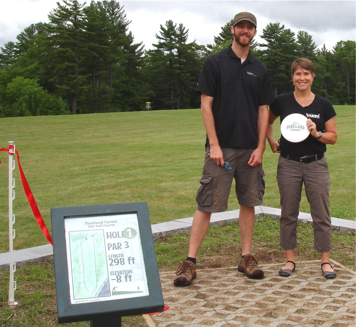 Kristina Sabasteanski displays a limited-edition Pineland Farms disc after she and Brian Giggey cut the ribbon at the grand opening of the Pineland Farms Disc Golf Course, July 25. Giggey, owner of Explore Disc Golf in Amherst, Mass., is the course designer. Sabasteanski is the director of the VAST (Veterans Adaptive Sports and Training) Program at Pineland Farms, a free program open to veterans with disabilities. A portion of the proceeds from disc golf sales benefit the VAST program. Photo by Patti Mikkelsen