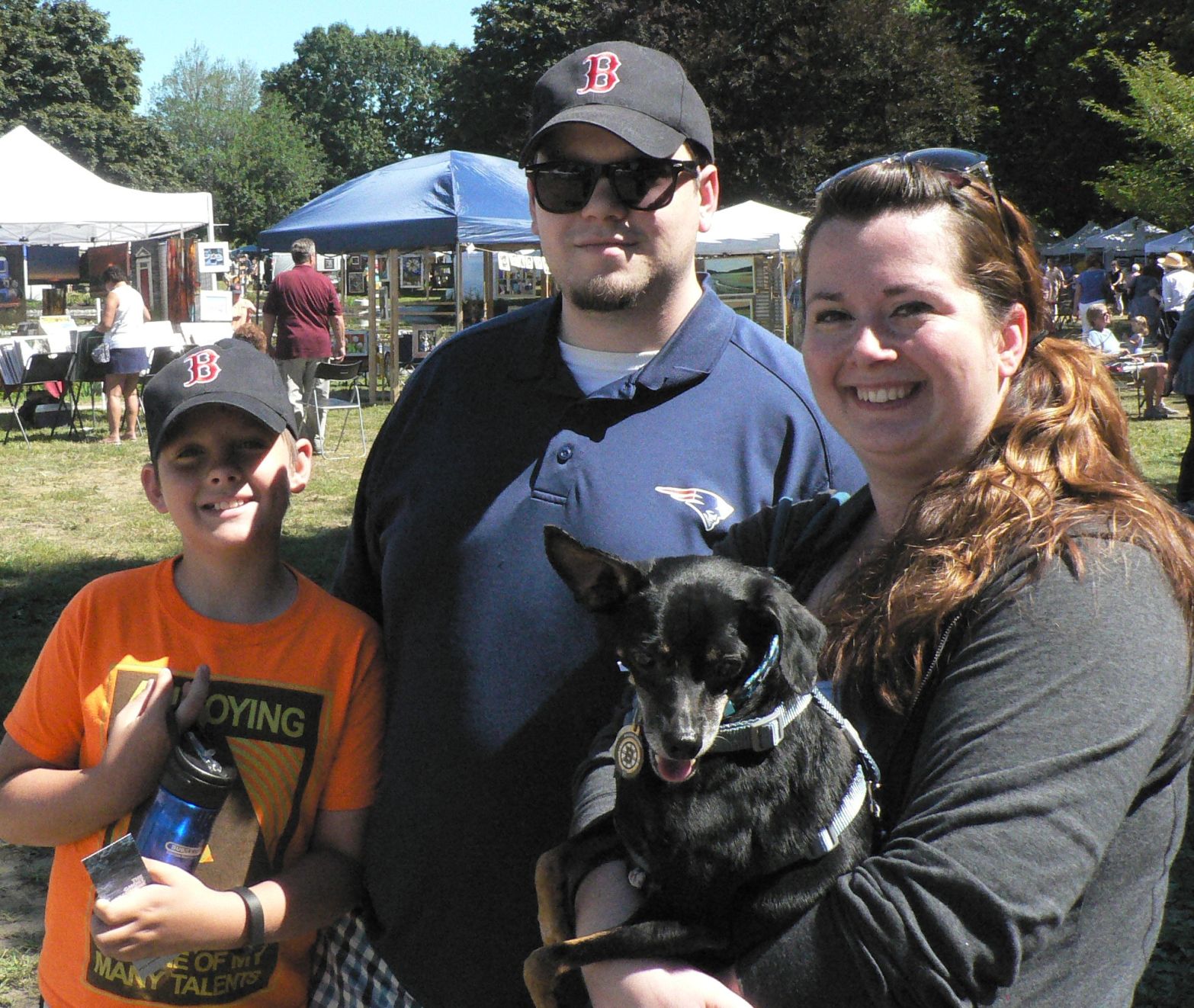 South Portland’s annual Art in the Park is a family event. From left are Brady Marquis, 10, Ben Marquis and Sam Stewart, holding her 10-year-old dog, Memphis.