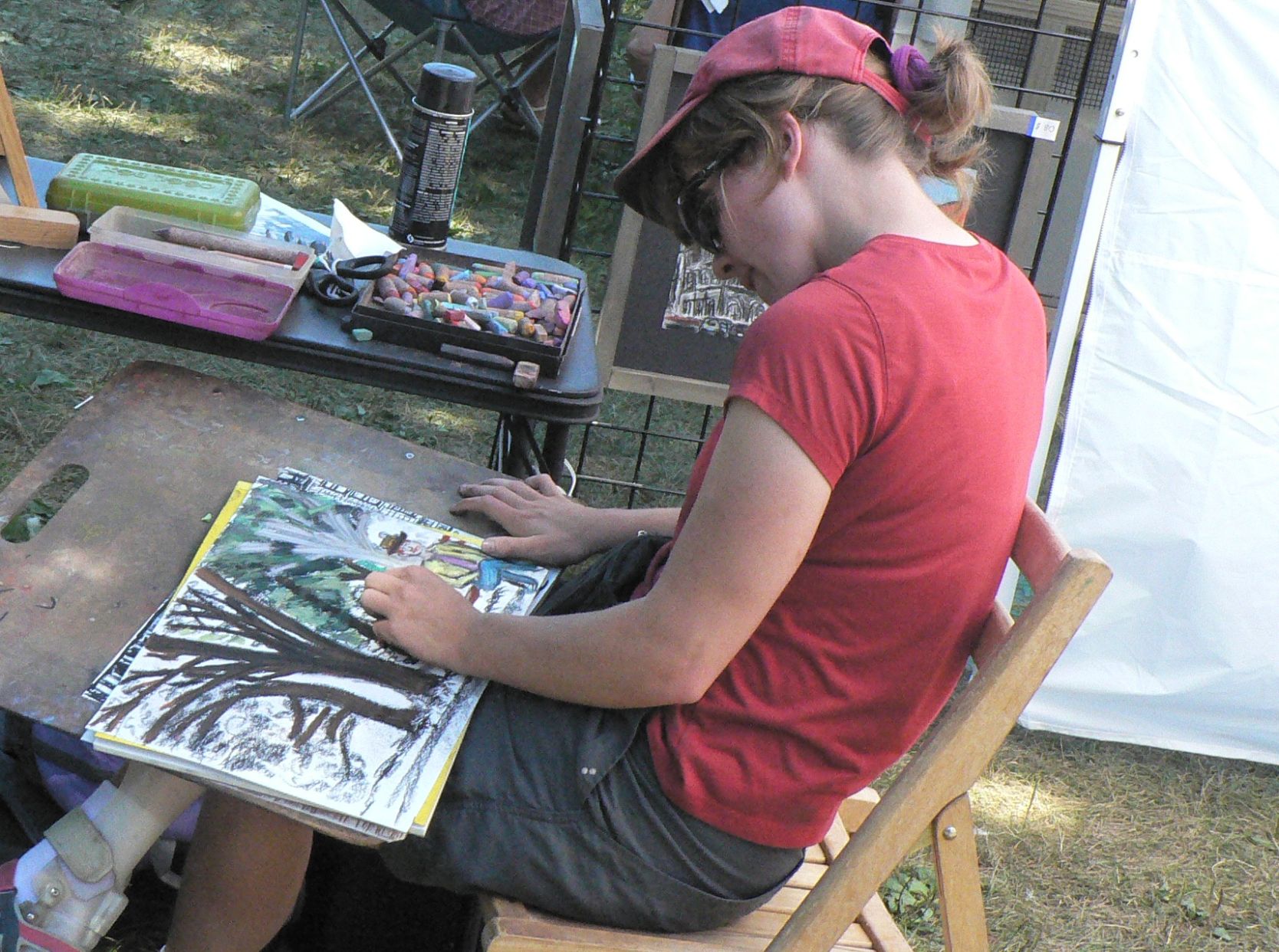NoraJean Ferris works on a chalk drawing during Saturday’s Art in the Park in South Portland. She’s exhibited at the show several times.