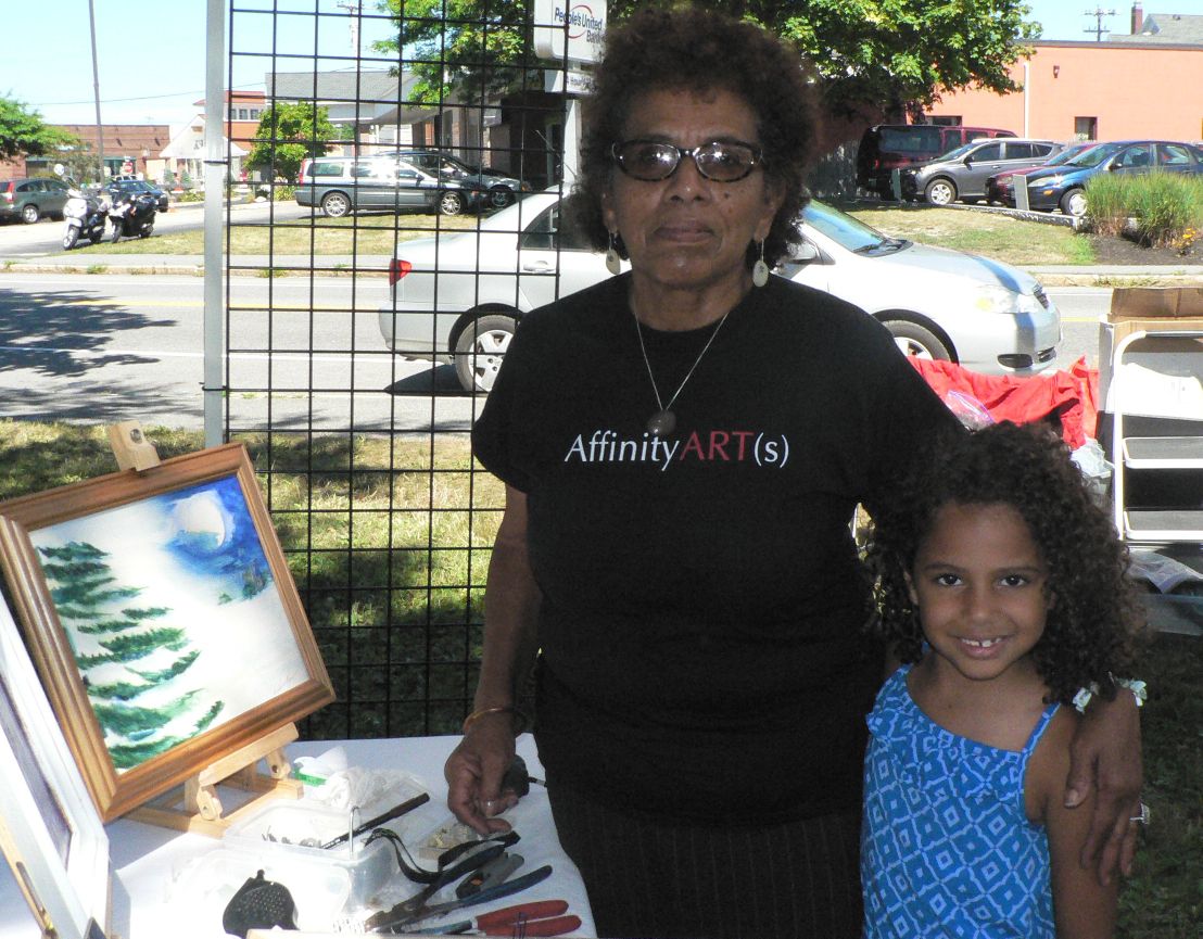 Artist Victoria Mares was one of the artists exhibiting at the Art in the Park in South Portland. She poses here with granddaughter, Naima Hershey, 6, who was one of the student artists selected for the annual show.