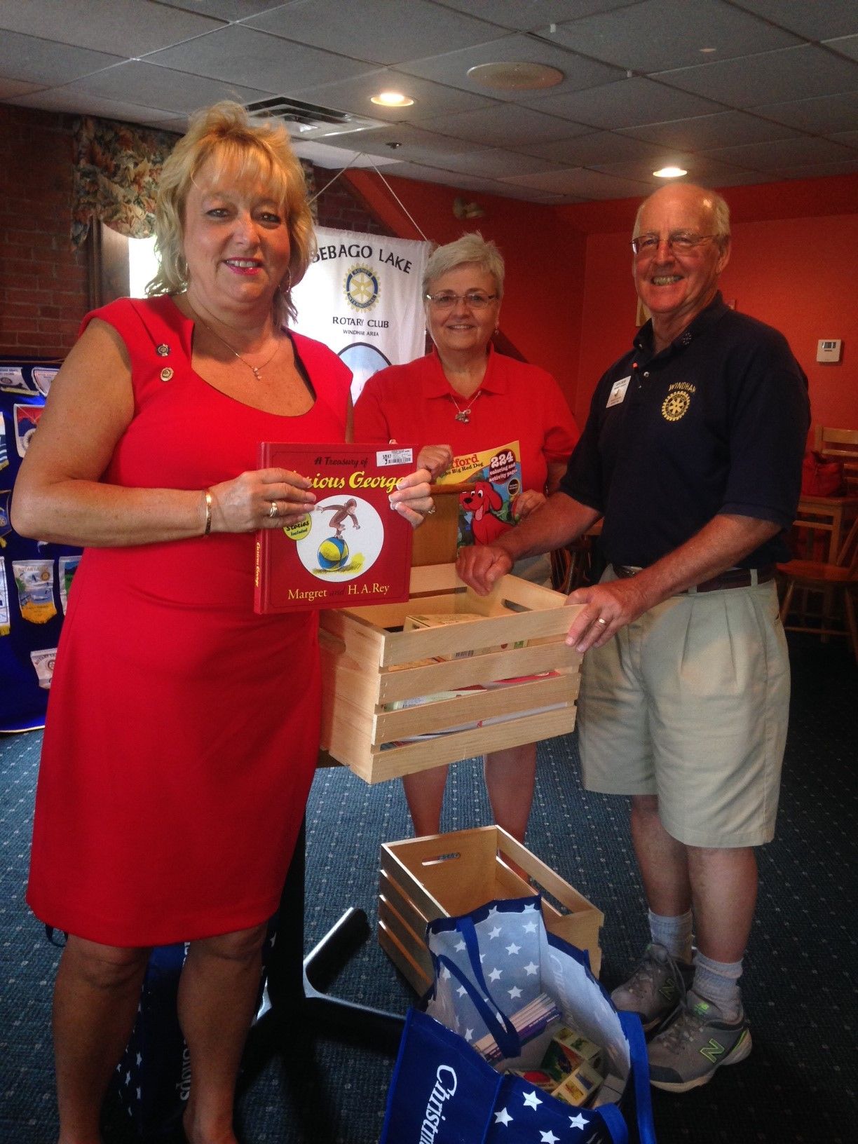 Members of the Sebago Lake Rotary Club recently donated books to the Windham Food Pantry as part of its Literary Project. Pictured is club president Deb McPhail, Colette Gagnon from the Windham Food Pantry and Don Drew, project coordinator for the Rotary club. Each month the club will replenish the crate with books that have been taken by families. If anyone would like to donate new or gently used books for this project, contact McPhail at mcphailda@gmail.com.Courtesy photo
