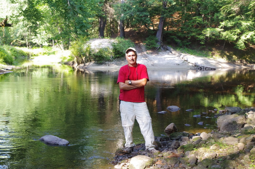 Stephen Sparaco, a Standish angler, stands in front of a section of the lower Crooked River off Route 11 in Casco that is heavily trafficked by landlocked salmon during the fall months. Sparaco opposes state efforts, which have now been postponed, to place a picket weir on the river. Staff photo by Ezra Silk