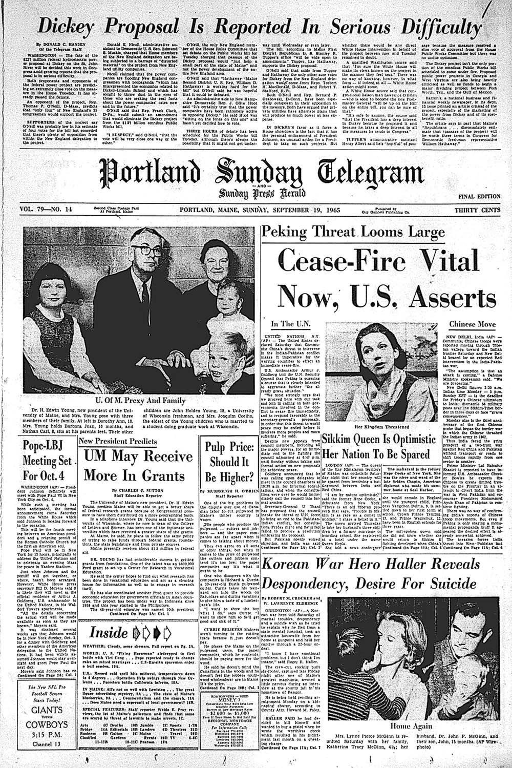 View the historic front page from the Portland Sunday Telegram: Dickey hydroelectric power proposal on St. John River is in serious difficulty in Congress; New U. of M prexy and family pictured