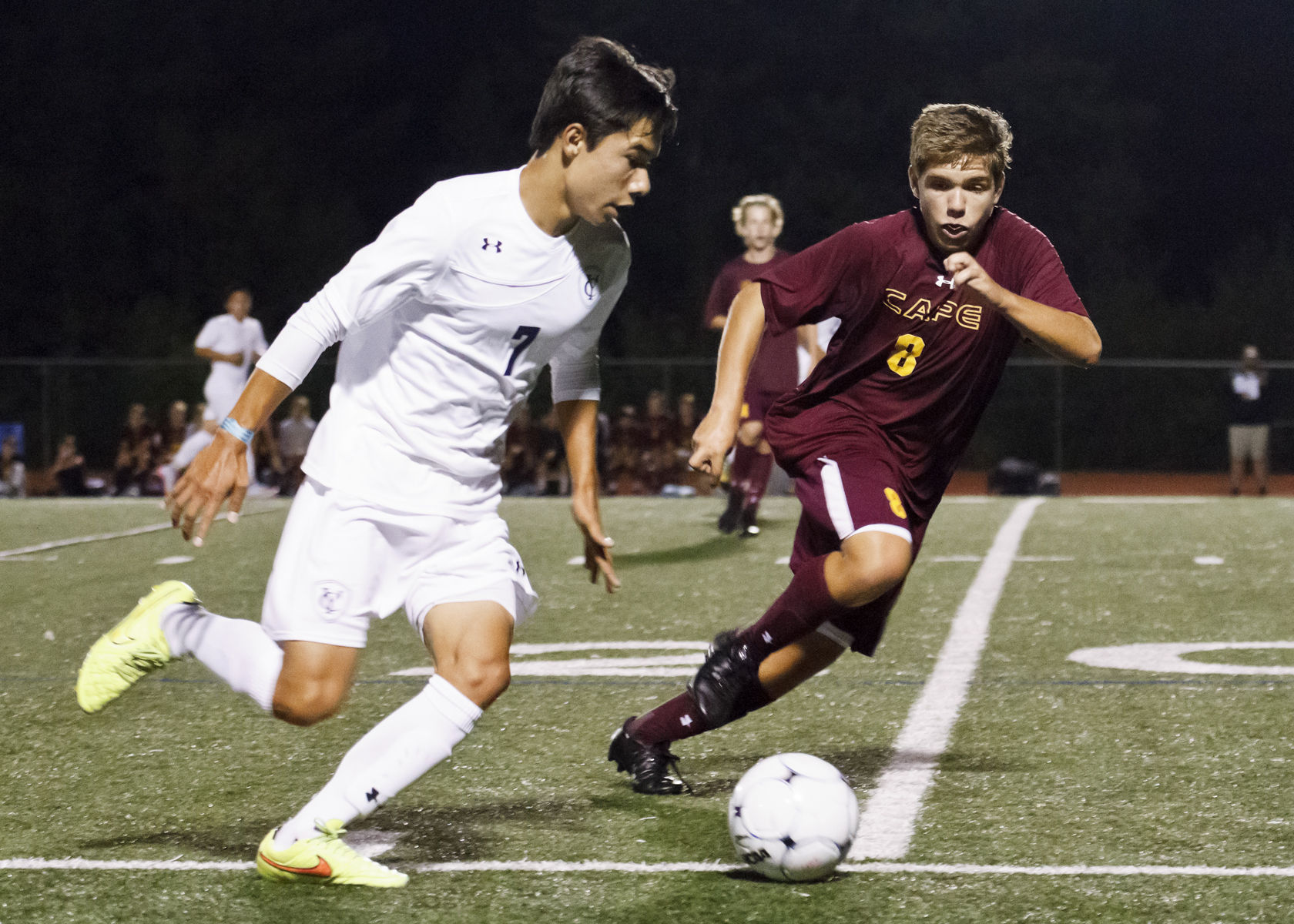 Yarmouth’s Jonathan Groothoff dribbles around Caper David Hare in the Clippers’ 4-0 home win over Cape on Saturday night.