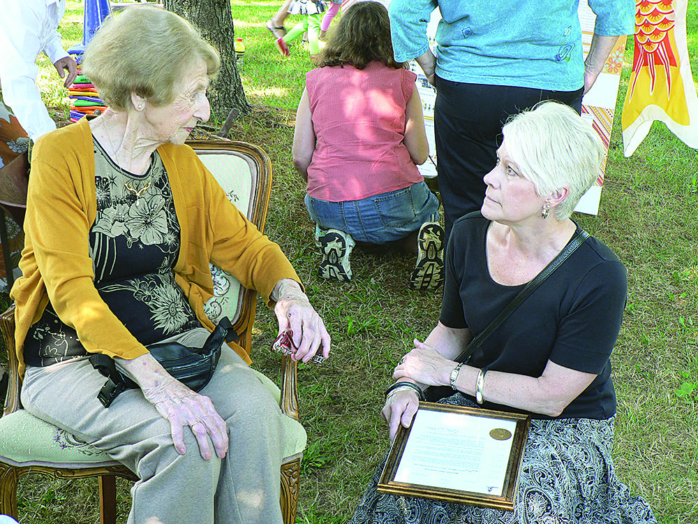 Marita Gould, left, with South Portland Mayor Linda Cohen during a community celebration in Ferry Village Saturday. Gould was recognized for her longtime residency in the city, as well as for the many music students she’s taught in her 101 years.Staff photo by Kate Irish Collins