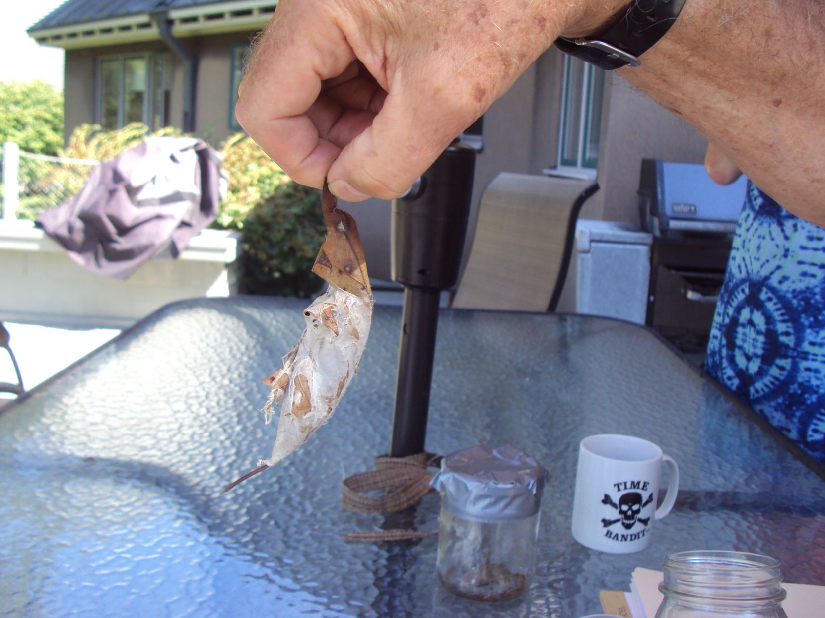 Bob Kinney picks up a nest that a brown tail moth made around an oak tree leaf on his property at the end of Wolfe’s Neck in Freeport. Kinney kept remnants of brown tail moths in two jars.