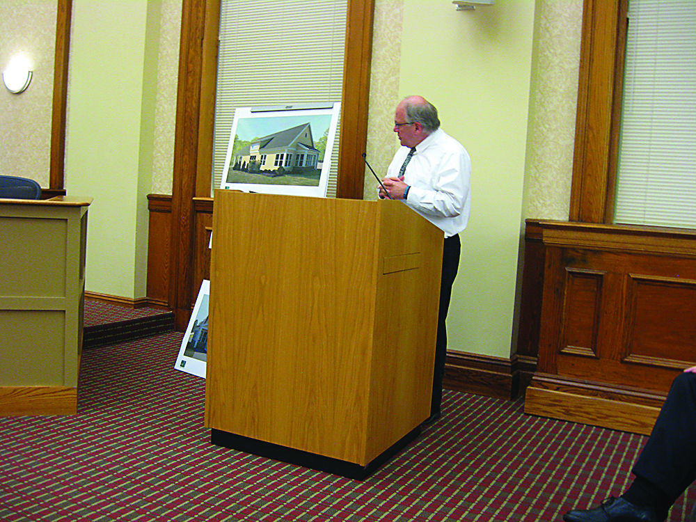 Brian Curley of PDT Architects shows the Gorham Planning Board on Monday a rendering for a new home Casco Federal Credit Union is asking to build on Ossipee Trail in Gorham. The branch has been located in the Nicely’s Market building. Staff photo by Robert Lowell