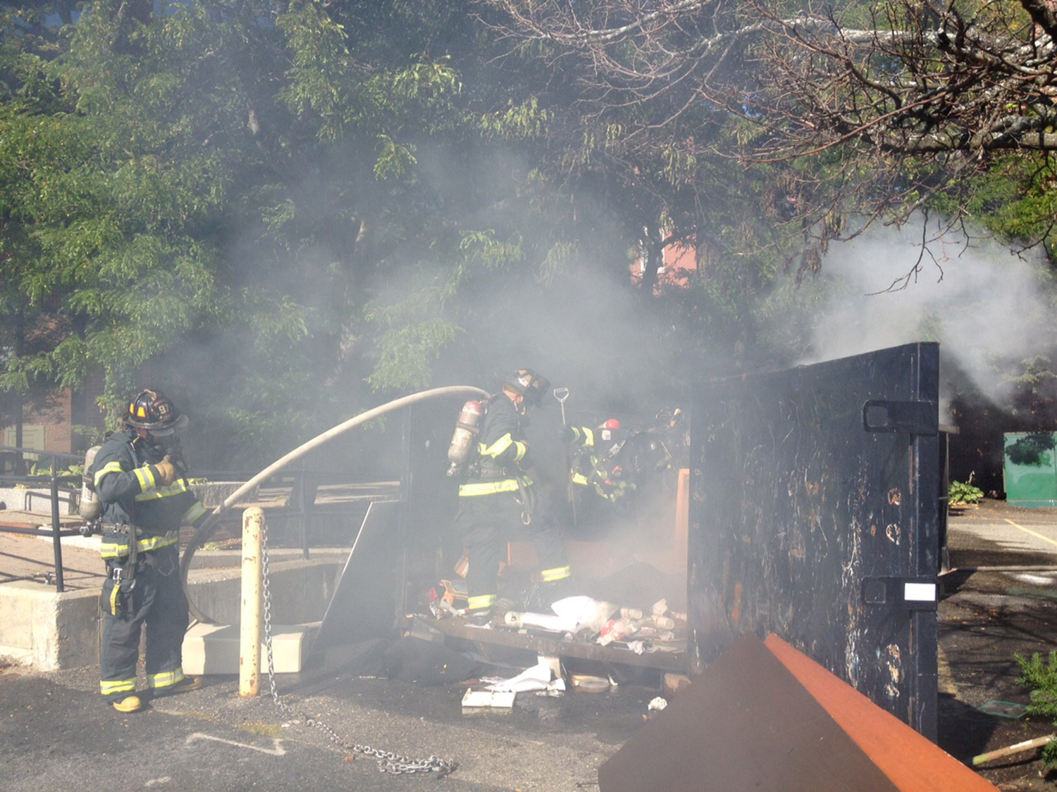 Portland firefighters extinguished a fire in a trash container alongside 261 Commercial St., a large building that houses the MEMIC insurance agency, on Friday around 3 p.m. Although the fire was extinguished quickly, it produced a large amount of smoke that got into the building and spread through the Old Port, said Fire Chief Jerome Lamoria.