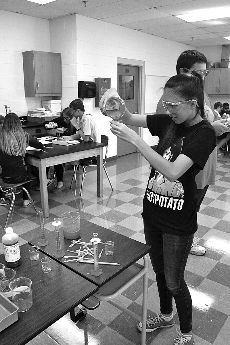 In Troiano’s classroom last week, students were conducting a lab to look at how cells maintain homeostasis. One student was placing blended pig liver into a beaker.