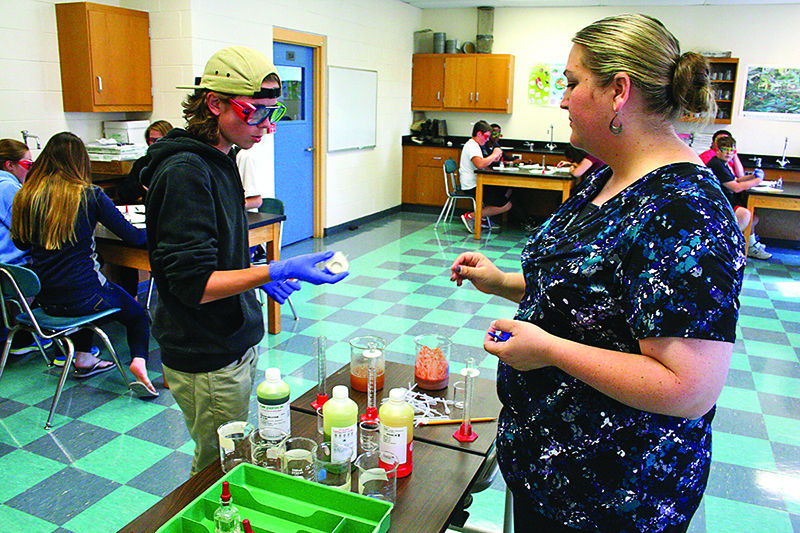 In Amy Troiano’s sophomore honors biology class last week at Westbrook High School, students wore bright-colored goggles, poured various substances – including blended liver – in and out of glass beakers, and recorded the results.