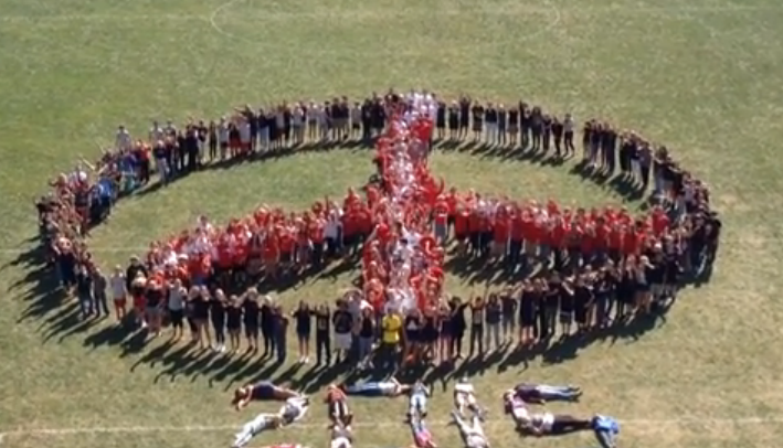 As part of its own celebrations the students at Mahoney took time at the end of the school day to create a gigantic a peace sign on the school’s adjacent playing field.