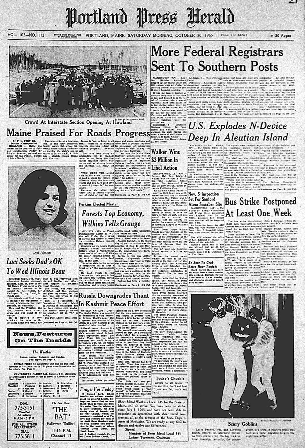 View the historic front page from the Portland Press Herald Luci seeks her LBJ’s approval to marry her beau; Inspections set for Sanford atom smasher site