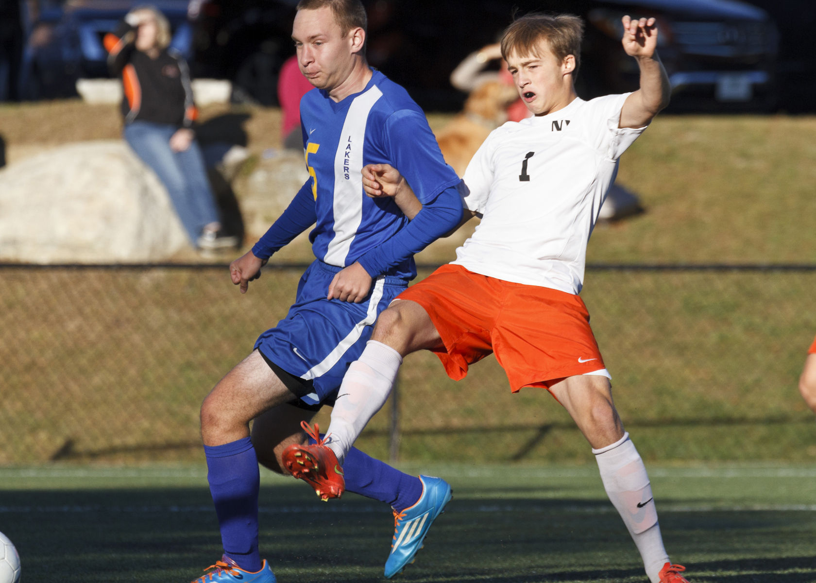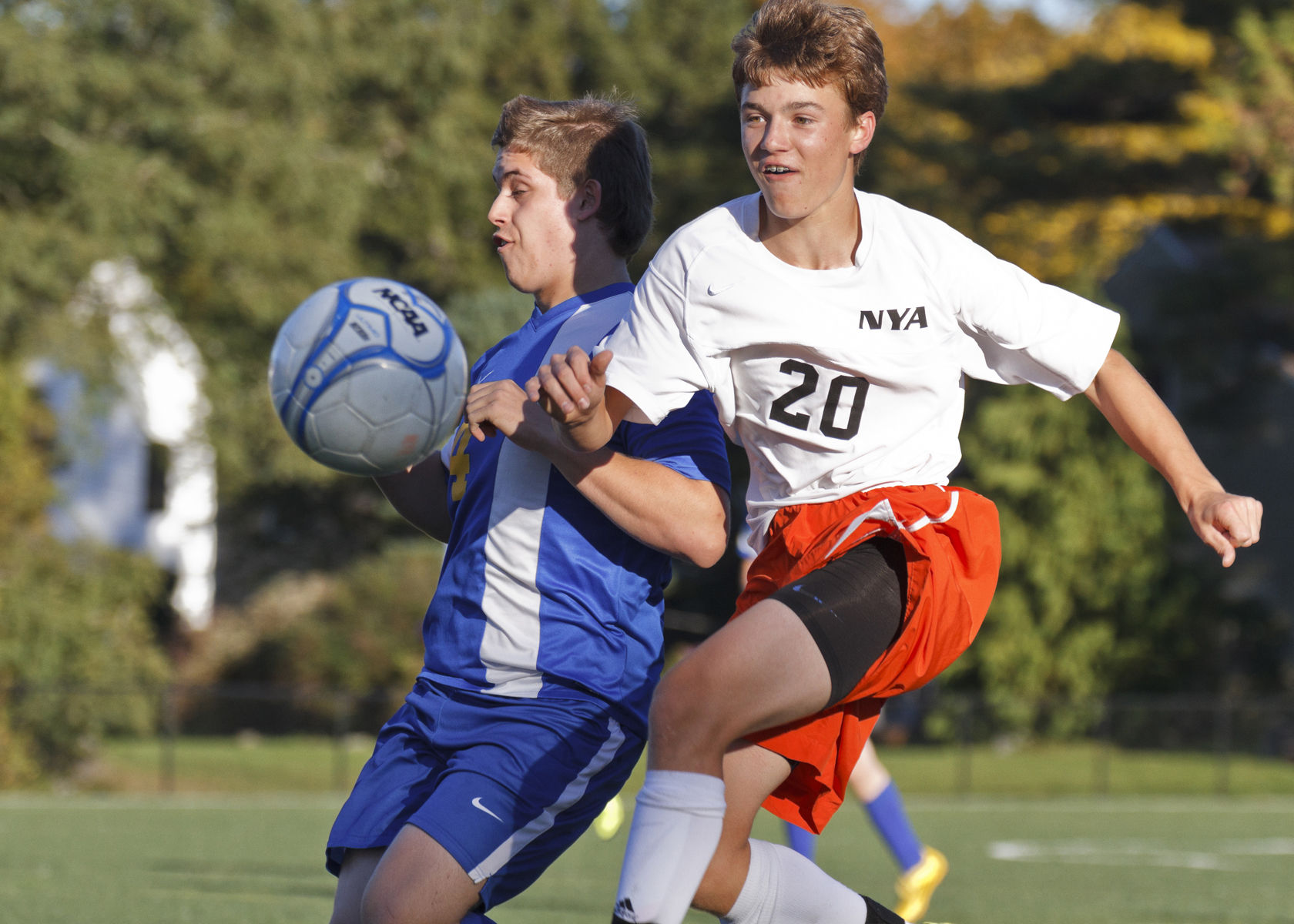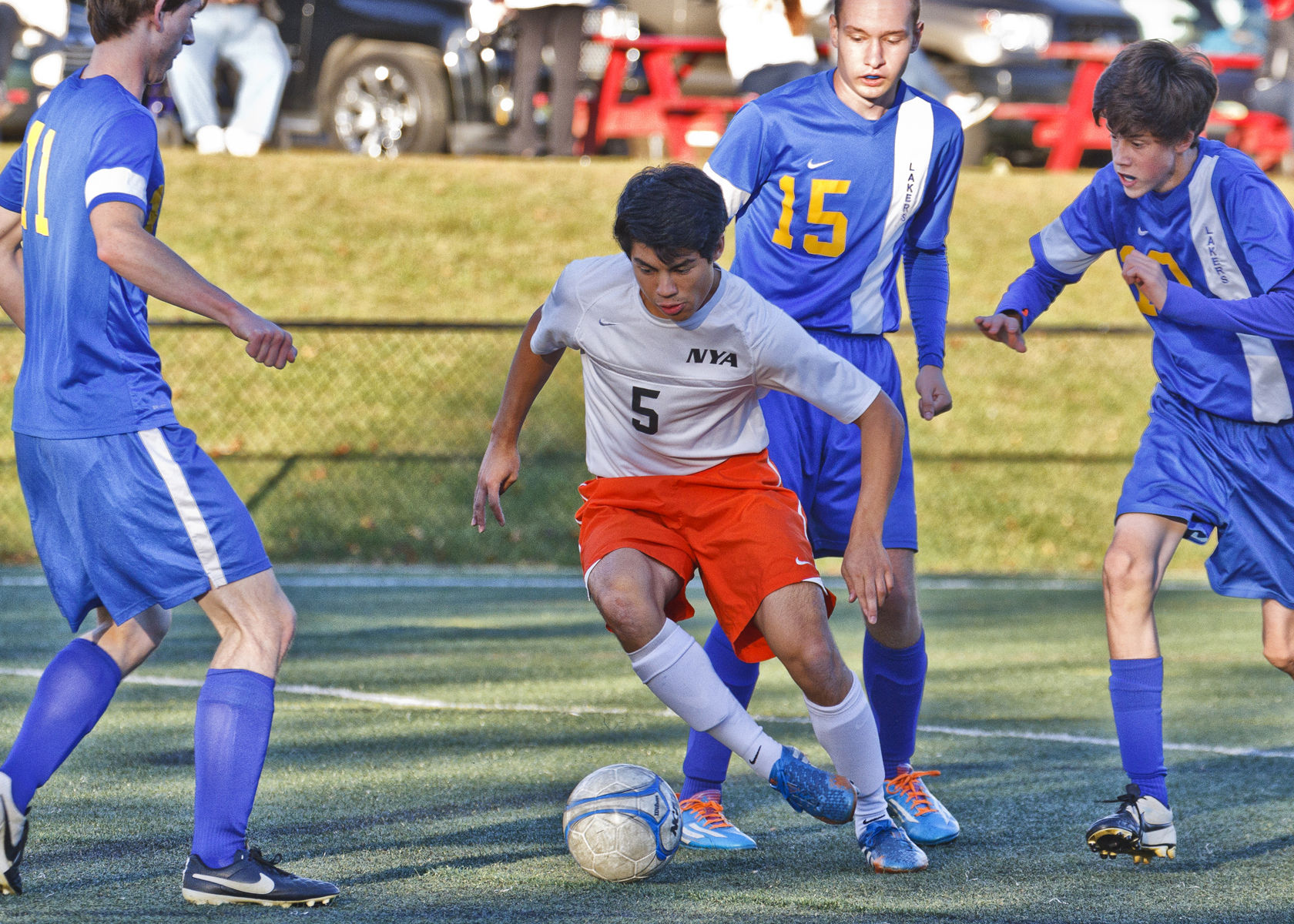 NYA middie Andrew Keith gets after the ball in midair while Lake Region’s Mason Laplante reacts.