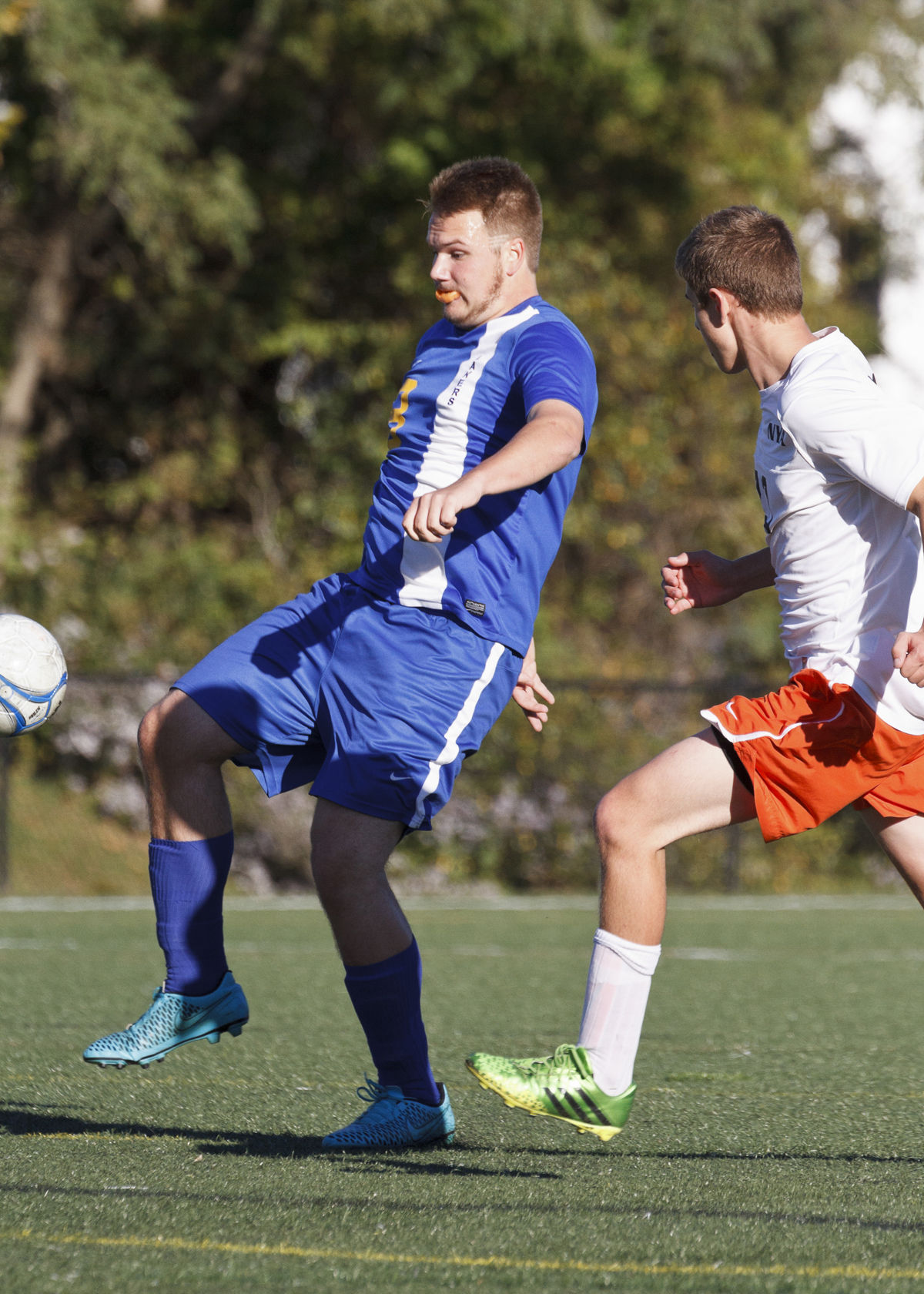 Laker Alex Langadas takes a touch on the ball as an North Yarmouth Academy opponent swoops in to interrupt.