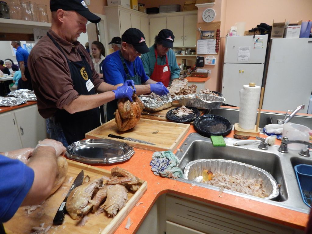 Falmouth Town Manager Nathan Poore, left, and volunteers Dick Anderson and Jim Smith help carve turkeys for the seventh annual Harvest Community Supper Oct. 15 at the Falmouth Congregational Church.