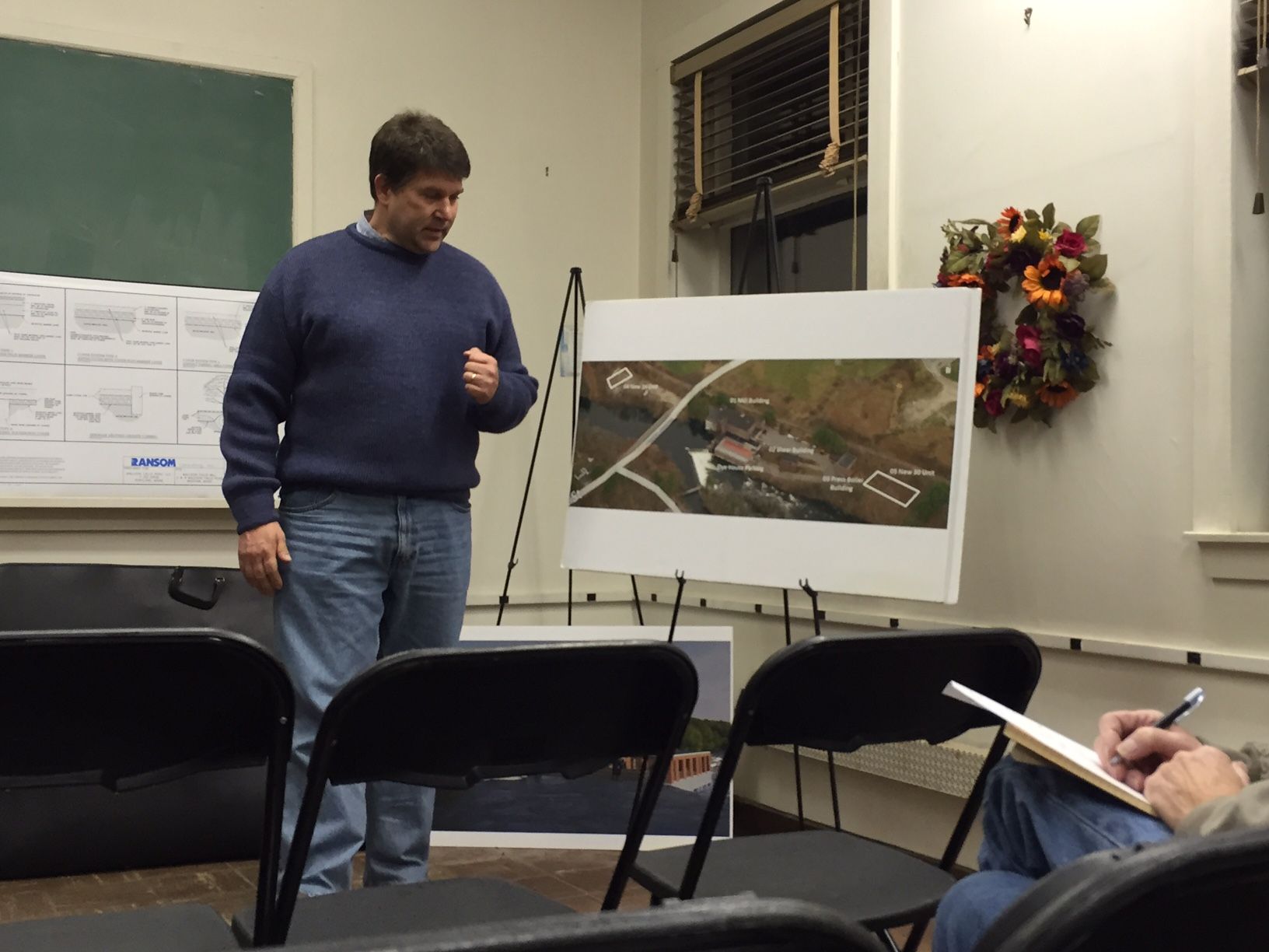 Frank Carr, director of business development for Hardypond Construction in Portland, speaks during a meeting inside the main Mallison Falls mill building on Dec. 3 about the firm’s renovation plans for property, which includes creating 109 apartment units.