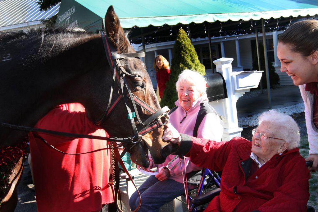 Ethel Knowles, a resident at Scarborough Terrace Premier Assisted Living and Memory Care in Scarborough, pets Camiturinmyway, a standardbred owned by Casey Gasbarro. Members of the Maine Harness Horsemen’s Association visited the assisted living facility to sing Christmas carols and spread some cheer Monday. At left is resident Lois Irving.