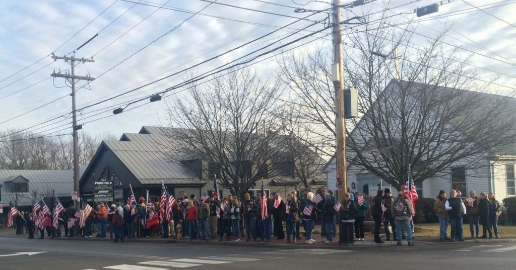Almost 150 people stood on Main Street Dec. 22 in support of the Flag Ladies, who have gathered at the corner of Main and School streets to wave American flags every Tuesday morning since 9/11. The crowd was there to stand up for the women, who claim they’ve been harassed by another resident.