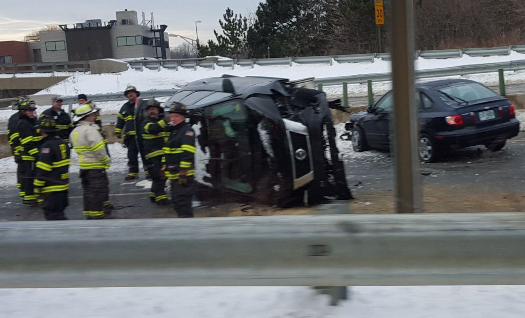 Firefighters at the scene of one of two accidents that snarled traffic in both directions Friday around 7:30 a.m. on Interstate 295 just north of Washington Avenue in Portland.