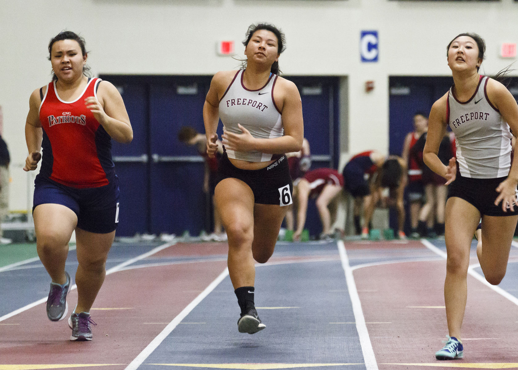 Freeporter Alice Murphy, middle, competes in the 55, alongside G-NGer Tram Ho, left, and fellow Falcon Mina Breer.Freeporter Tom Doyle finished fourth in the Mile.