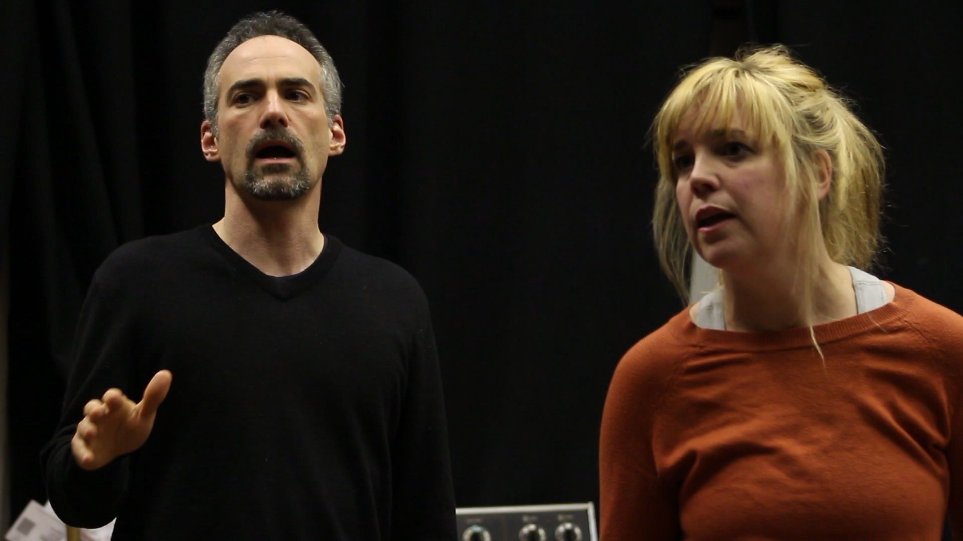 “Trevor” actors Mark Rubin and Shannon Campbell perform during a recent rehearsal. The show runs for the next two weekends at Mad Horse Theatre Co. in South Portland.