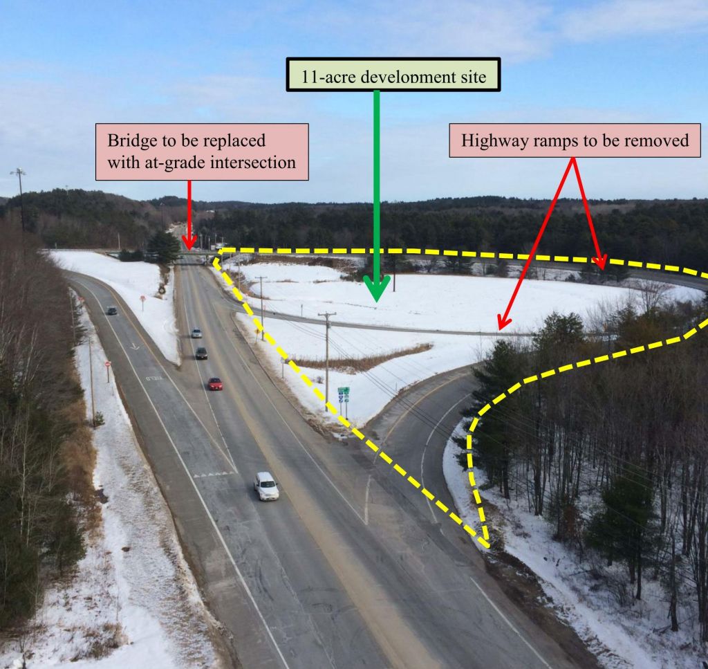 The land, at the eastern end of the Maine Turnpike Falmouth Spur, will be given to a developer by MDOT. The developer selected by the town will have to remove the turnpike overpass and ramps and create a grade-level intersection on Route 1 in exchange for the land.