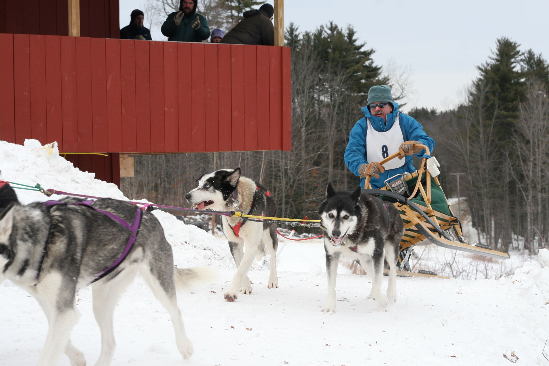 With the crowd watching, Jake Turner taking off at the six-dog sled race.