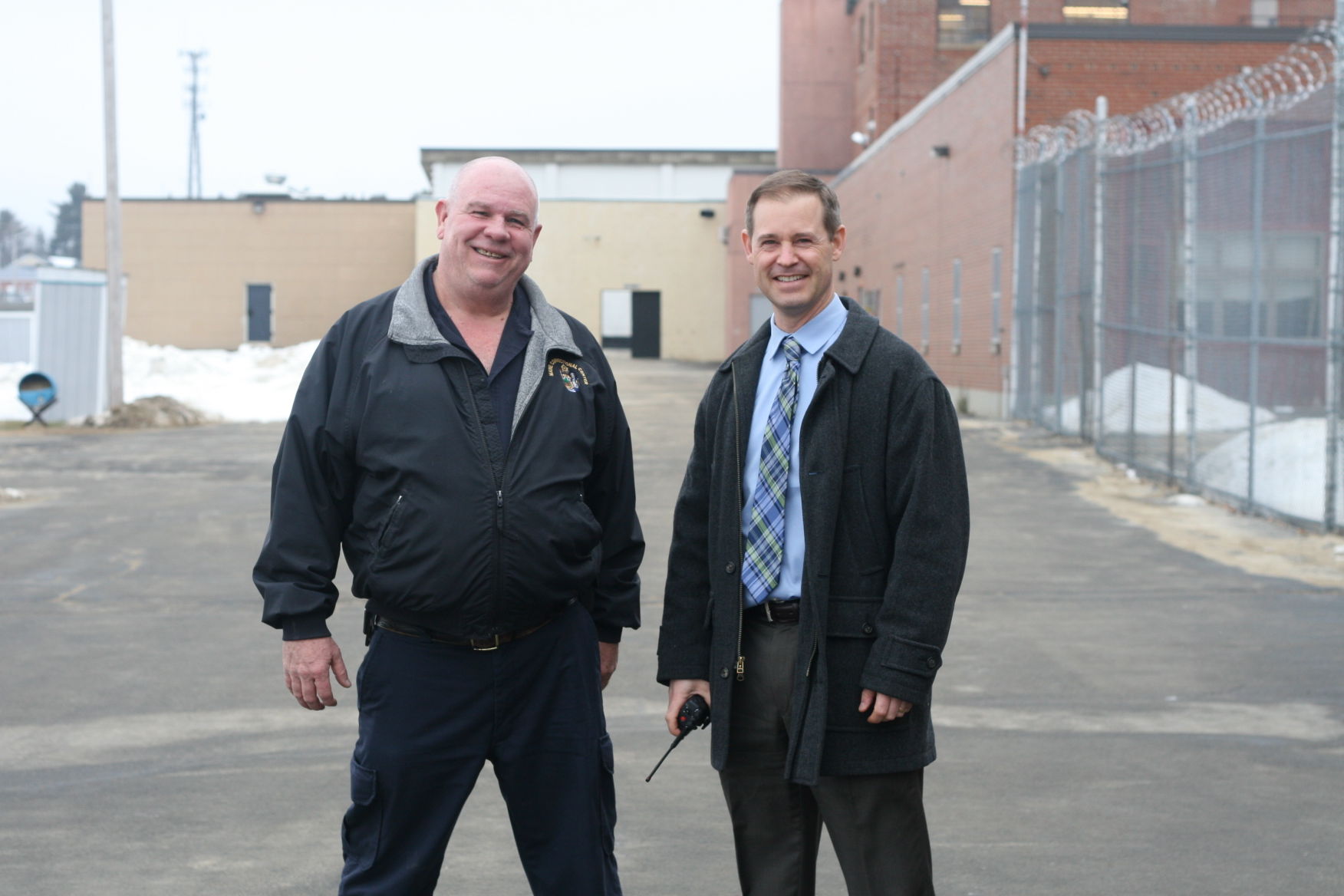 Jack Hardon, left, an officer at the center, and Warden Scott Landry, right, giving a tour of Windham’s correctional center.