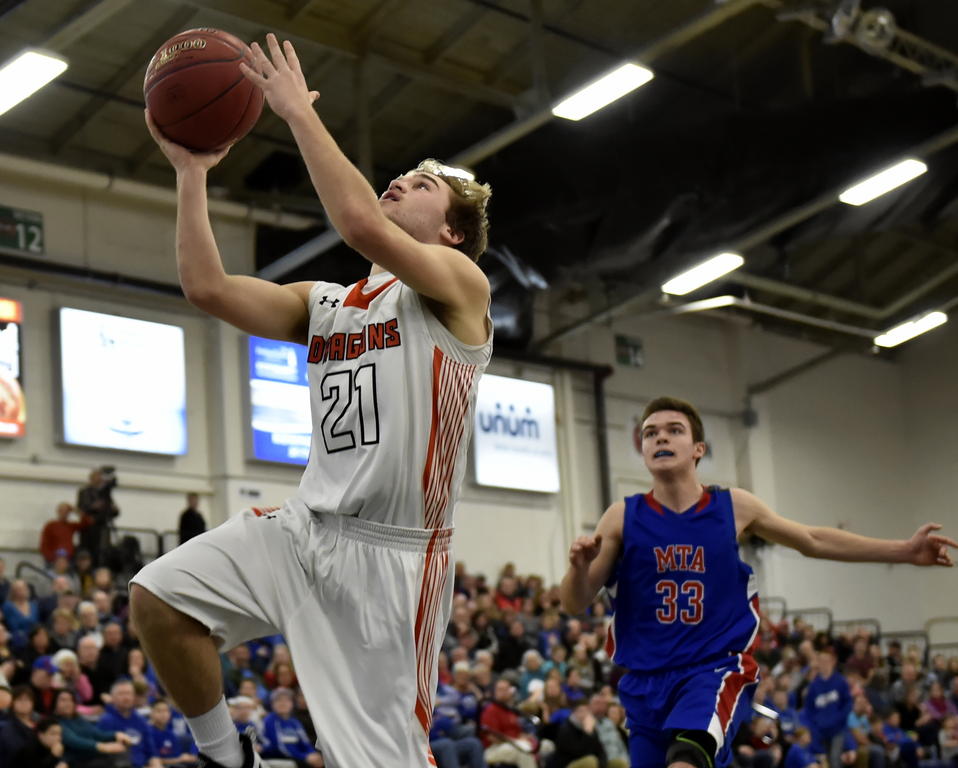 The fourth-ranked Dragons beat the fifth-seeded Eagles for the third time this year, taking a 14-1 lead after one quarter and never trailing. Mt. Ararat did make it 22-19 at halftime, but Brunswick gradually pulled away to win 61-52, behind 21 points from Caleb Cost.