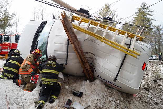 Because the broken pole was hanging over the vehicle, Poland firefighters had to wait nearly an hour for Central Maine Power to make it safe for them to extricate Grant, who was trapped in the van.