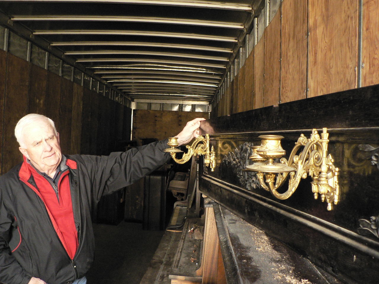 Kelley shows off an ornately decorated and carved piano frontpiece. In November, he bought a tractor-trailer full of antique upright pianos.