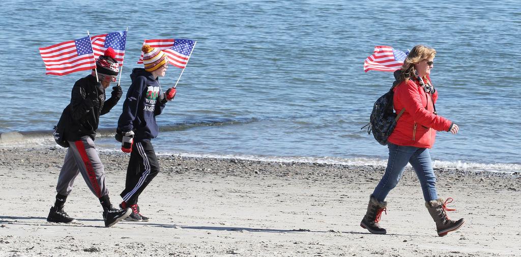 Mekhi Bitjoka, left, and Brady Kirk, both 12, and Brady’s mother Jennifer Kirk, program assistant at the Boys & Girls Club of Southern Maine in South Portland, walk along Willard Beach on Saturday, Feb. 27, while participating in a four-mile tribute march with The Summit Project. (Melanie Sochan / For The Forecaster)