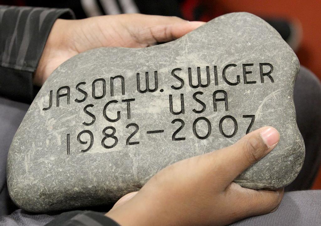 Mekhi Bitjoka, 12, holds The Summit Project memorial stone of U.S. Army Sgt. Jason W. Swiger of South Portland during a ceremony at the Boys & Girls Club of Southern Maine in South Portland on Saturday, Feb. 27. (Melanie Sochan / For The Forecaster)