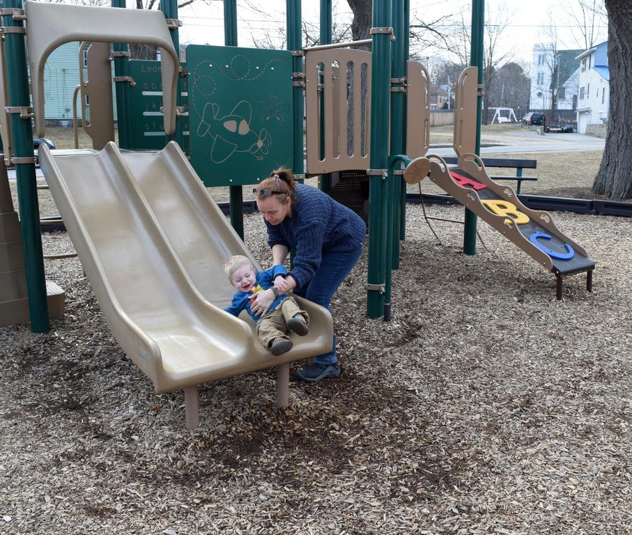 Angie Jones plays with her grandson, Patrick Lacy, at Heseltine Park off Ocean Avenue in Portland on March 9. “Every nice day, we try to get over here, Jones said.