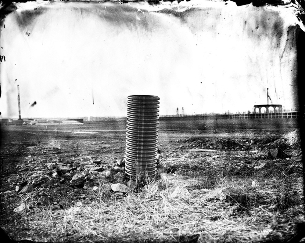 Caswell’s tintype object portraits follow the rich-toned but low-contrast monochrome to achieve history-flavored and meditative observations of interesting objects: a labyrinthian transmission in a puzzle-flat pose, a hexagonal manhole-like cover set in the ground, a pair of wizened high-desert goggles, a camera-carrying rocket kit with the wooden matrix not yet punched out, hive hexagons and so on. Caswell makes larger digital versions of the tintype image, with varying degrees of success. The images’ theatricality can detract from the otherwise observational logic of Caswell’s best work. For example, a posed image of a drone pilot has an iconic quality on its own when seen as an advertising image for the show, but it detracts from its exhibition neighbor, the much more sophisticated and thoughtful “Bone Hole,” a dark image focused on a hole shaped by the cow femur-like bone removed from and placed to the side of it. The hole is the key feature because it is a trace of observer effect and part of the landscape while, more importantly, it is the evidence of where and what the bone was in its nature-oriented, pre-observation situation.