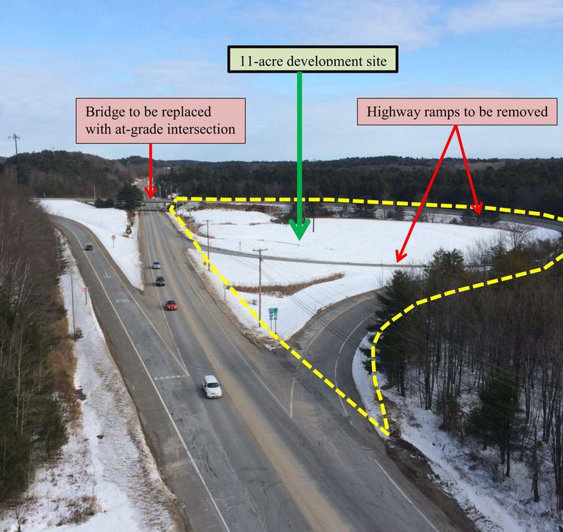 The land, which became available as a result of a partnership between the Maine Department of Transportation and the town, is at the eastern end of the Maine Turnpike Falmouth Spur. The MDOT will give the land to a developer selected by the town and, in exchange, the developer will have to remove the turnpike overpass and ramps, and create an at-grade intersection.