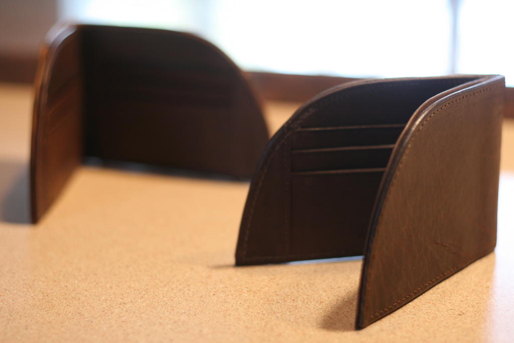 The wallet comes in a number of different materials, from bison leather to baseball glove, canvas and nylon. It’s very thin, and when closed, looks a bit like a shark’s fin.