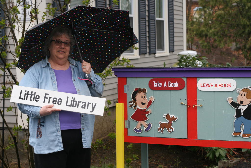 The perfect fix for a rainy day: a free book. Betty Perry of Standish, above, said she hopes her Free Little Library will promote literacy and build community by providing access to free books in the village area.