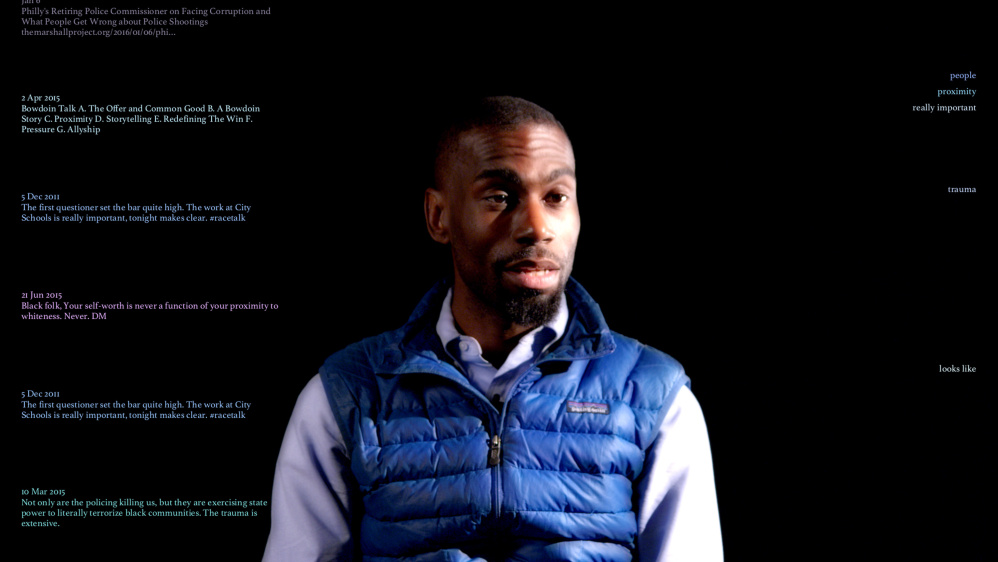 The local connection is DuBois’ portrait of Bowdoin alum and civil rights activist DeRay Mckesson, a leading figure in the Black Lives Matter movement. The portrait features a filmed interview of Mckesson answering 32 questions provided by Bowdoin students. On the left of the video is a Twitter feed that posts relevant quotes from Mckesson’s more than 150,000 tweets.