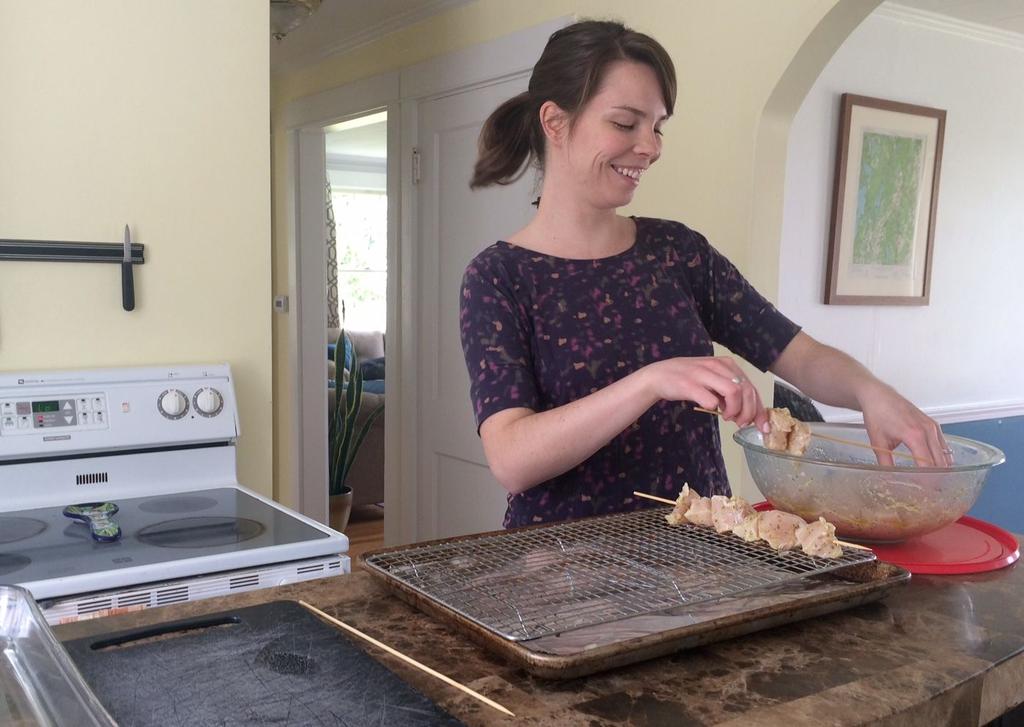 Shannon Morris of Yarmouth, owner of the recipe subscription service Spiced Pantry, makes souvlaki chicken on Monday as she tests recipes for delivery next month.