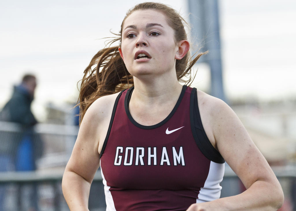 Libby Knudsen runs a leg of the 4×800 for Gorham at Scarborough last Friday.