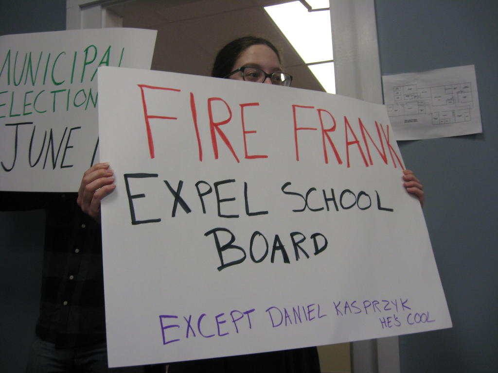 Victoria Hugo-Vidal of Buxton peers over her sign at the SAD 6 school board meeting Monday before the board announced that Superintendent Frank Sherburne had resigned.